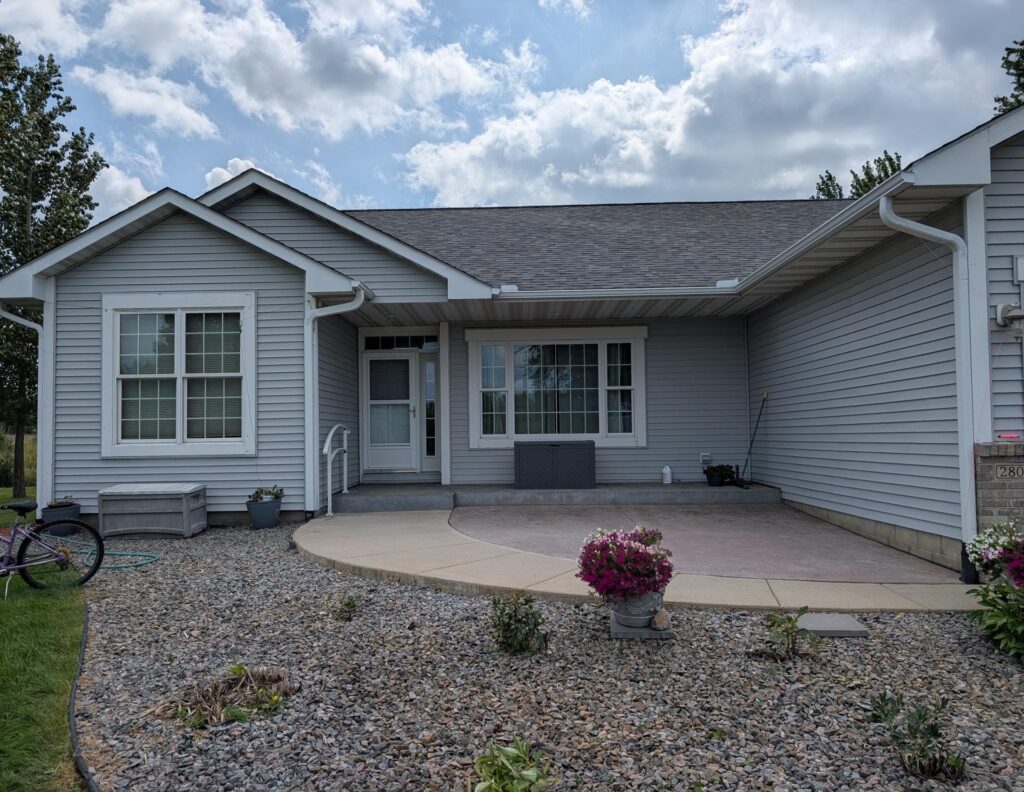 White gutters and downspouts were installed by Schmidt Seamless Gutters on this home in Cleveland, MN, on Cedar Trail Court.